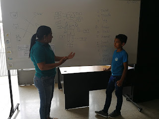 Today, in the Bible lesson, we learned about Lazarus, jesús good friend, and how, at times, God has control of everything, although every thing looks like the opposite. We reviewed words that refer to the body (like “arm”) in English with a fun game that Teacher Damaris brought.